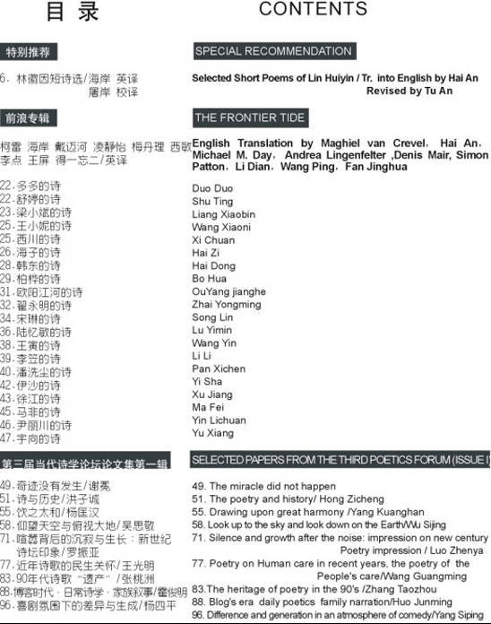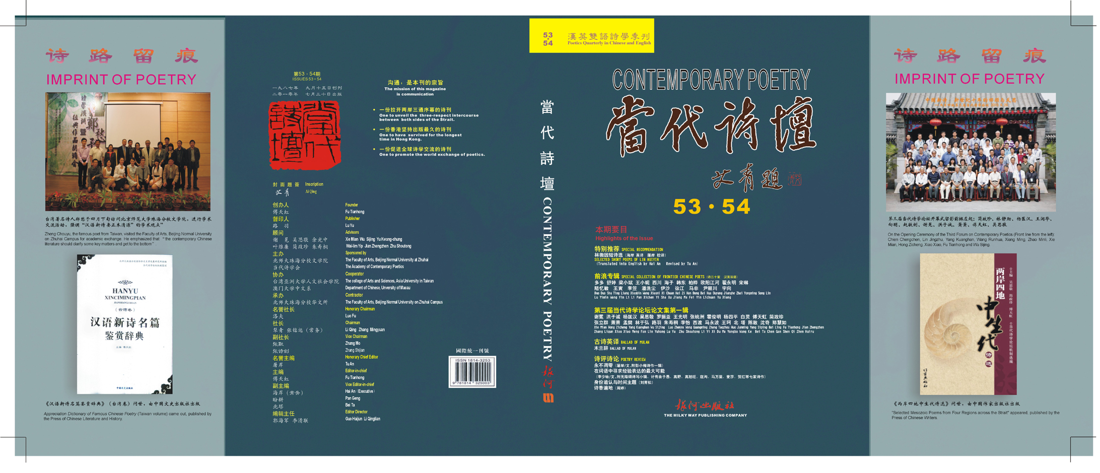 本期开始,《当代诗坛》诗学季刊将由当代诗学会和北京师范大学珠海分校文学院联合主办,实力雄厚的澳门大学中文系也加入了协办行列,以此结合成两岸四地的学术方阵,今後将明显加重理论篇幅,势必为中国新诗的研究和创作带来新的气象。