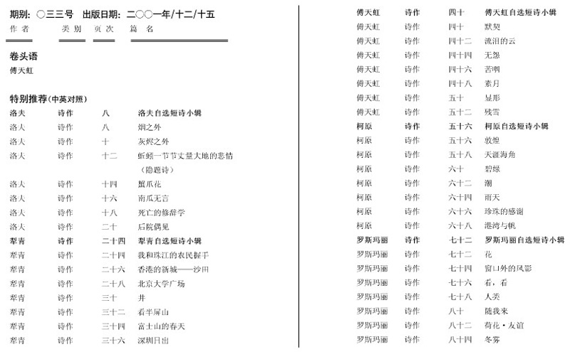 第33期卷头语 捧读一封又一封的来信,接听一个又一个的来电。如同挚友们就在面前,诗把我们溶化在一起,谈到诗,我们便忘却了窗外的风雨,忘却了重负和压力。感谢诗友们对双语名家小辑的一致好评,应大家要求,我们会继续努力去组编这方面的稿件。刊物出版仍是举步为艰,自从香港政府停止资助后,一切资金全靠自己,香港许多纯文学报刊都在面临同一命运。大家都在挣扎,也许生活的真面目原本就是如此,但爱好所在,只要还有一点气力,我们就会坚持走下去。谢谢大家的关切,请多支持。傅天虹2001年12月15日~