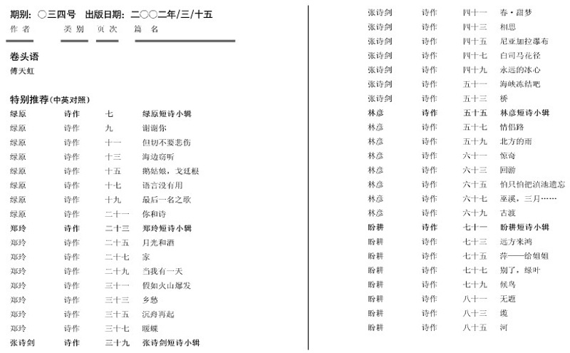 第33期卷头语 转眼已进入2002年,本刊也跨入生存的第十五个年头,令人难过的事,稿积如山,然能力有限,始终无法克服脱期的困境,辜负了关爱者的期望;令人欣慰的是,我们的诗刊仍然还在顽强地活着,就像我们还在顽强活着一样。