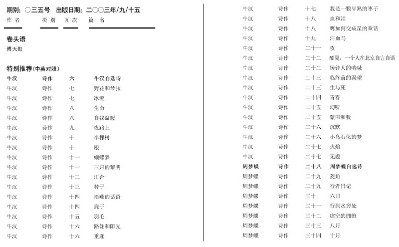 第35期卷头语 一直埋头在忙,不觉创刊竟已十六个寒暑了。有政府资助也好,现在没有资助也好。我们都在坚持出版。诗的天地是美的。却有许多无形的墙,尤其今天。本刊的旨意,在与沟通,无论两岸,还是中外诗坛。 出诗刊已不易,出双语诗刊更难,我们小试一下,分布全球的38位编委一起出力,历时半年,刊物也就完成了,且作为16岁的纪念日吧!香港大学要颁一个奖给本刊,这也算的上是一份生日礼物,可见苦中,总还是有乐的。 本期重点推出两岸老诗人牛汉和周梦蝶的自选诗各一大辑,足以体现两位的不同风格,可试作比较和欣赏。此外,名家作品荟萃,不一一介绍了。 付印前,感谢台湾诸位编委审阅校样,此外,本人不还亲赴高雄向余光中教授约稿,余教授答应将提供自译诗作一辑,并同意今后出任本刊顾问,在此均表深深感谢。 下一期,我们还将刊出卞之琳自译诗辑,以及王辛笛自选短诗辑等。