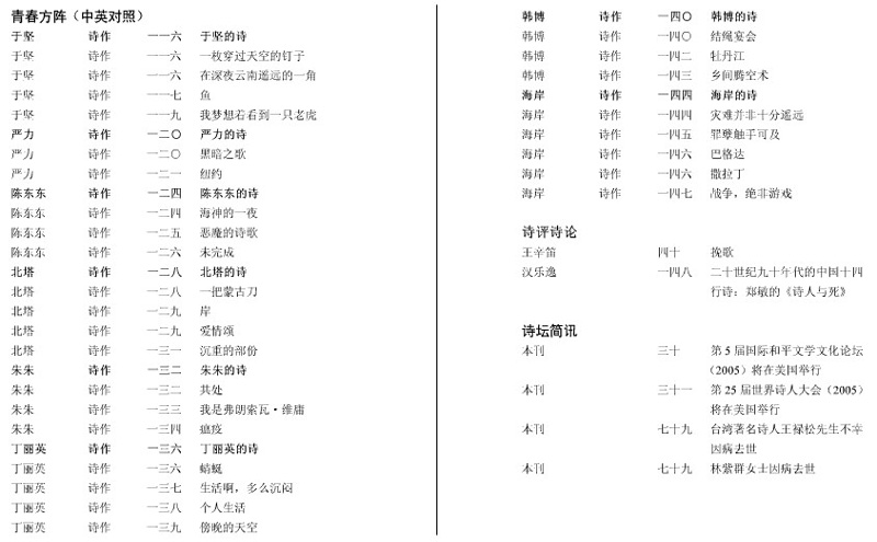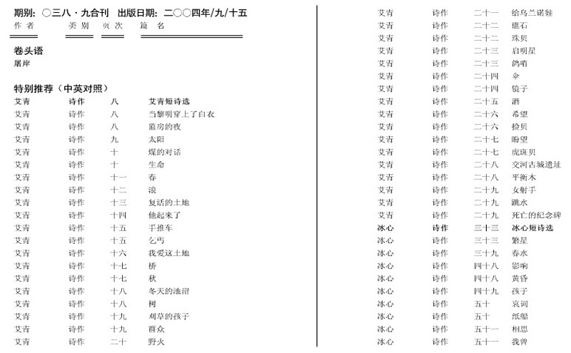 第38·39期卷头语 什么是“经典”?就文学范畴来说,它必须是具有深厚传统、高度艺术权威和广泛影响的名著。它是历史形成的,得到广大读者认可的,经久弥新的文学杰作。诗歌经典,就应该是这样一类诗歌作品。近来有些出版者把“经典”的桂冠奉送给某些一般性作品,以抬高其地位,这使读者感到困惑。有人感叹说“经典”贬值了! 本刊的“特别推荐”栏,力求推出真正经典诗人的真正经典作品。最近几期,我们努力这样做。第35期推出牛汉,周梦蝶;第36期推出关之琳、王辛笛、余光中;第37期推出臧克家。蔡其矫、彭邦桢。即使是已有定评的经典诗人,他们的作品也是有层次的。我们力求选用他们的最佳作品或最有代表性作品,只要有可能我们就请他们自己选诗,比如牛汉、王辛笛、周梦蝶等。本刊是汉英双语刊,所刊载的有些经典诗人的诗,不仅自己选出,而且自己译成英文,如卞之琳、余光中,我们这样做,目的是为了把中国新诗中最优美、最精粹的作品奉献给中国和世界的读者,并且给中国和世界的文学史留下恒久的印记。 本期(38·39期合刊)“特别推荐”栏推出艾青、冰心的短诗选和郑敏的十四行组诗《诗人与死》,都是经过精选的诗歌经典。这些诗的英译也经过认真的推敲。荷兰汉学家汉乐逸的论文《二十世纪九十年代的中国十四行诗:郑敏的<诗人与死>》是一部很有分量的理论力作。 本刊的“实力方阵”栏推出的诗作,也有一部分达到了“经典”的水平。属于他们。本刊为他们提供了可能充分的园地。他们踏着前人的足迹走来,开创诗的新天地。诗歌经典的宝库永远不会封顶。新一代诗人的作品将经过时间的筛选,沉淀出新的经典。 诗坛的圣火,将一代又一代地燃烧下去,永远不会停息。 本刊愿意成为这一圣火接力棒的传递者。