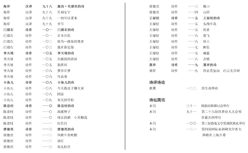 第42期卷头语 中国现代汉语诗已有八十余年历史,经历了荣与枯,丰与窳,沉沦与崛起,迂回与进制,它已接近百年,有待小结,以利新的开拓与创造。 《当代诗坛》自一九八七年九月创刊,到现在,经过了十八年岁月,出到第42期。它经历过曲折的痛苦,获得过成功的喜悦。沟通,是本刊的宗旨。在沿着既定方向前进的时候,我们为自己提出三项任务: 一、团结。汉语新诗诗人和诗作诞生在中国大陆、台湾、香港、澳门以及海外的世界各地。他们和他们创作的汉语诗包含各种哲学倾向和思想意识,包含各种风格、形式、流派、题材、体裁。我们主张在热爱祖国、歌赞人性、弘扬正义,开怀人类的旗帜下,所有的现代汉语诗人团结起来。让我们摒弃一切门户之见,宗派情绪,小圈子主意和文人相经的陋习,为了一个目标继承和发扬中国古典诗歌的优良传统,正兴和发展中国现代汉语诗,把它推向新的百花争艳的辉煌,我们携手前进,并肩奋斗。 二、抢救。如果“抢救”的提法有些过分,那就提“保存”。中国现代汉语诗为世界文学提供不少杰出的诗人,大量经典作品和优秀作品。而诗歌作品真正的价值存于文本,一切都是空谈。这些文本正在散佚中。为了充实世界文学宝库的库藏,我们有责任抢救或保存(包括整理,英译)中国现代汉语诗的各种优秀文本。 三、突围。当前,中国现代汉语诗潜流汩汩,主流低迷。在商潮和拜金主义的催动下,娱乐文化、消闲文化、快餐文化以至文化垃圾包围诗歌。反传统、反崇高,反英雄、反优美、反诗语等种种思潮对诗歌进行猛烈地侵蚀。平庸化,烦琐堆砌,泛散文化,抒情放逐,都在“先锋”的旗帜下堂而皇之进占缪斯的圣殿。诗歌如果表现出对祖国的挚爱,对人性灭绝的痛恨,对优美情操的歌赞,对人类的悲悯情怀,往往受到嘲笑。如今,中国现代汉语诗危机四伏,处于极不正常的受围剿的状态。对于中国现外层主语诗所面临的困境该如何应对?我们认为反僵化、反教条完全正确。但不能从一个极端走向另外一个极端。目前,全力抢救保存优秀诗作和宝贵史料已是当务之急,我们必须为中国现代汉语诗保留一块净土,加强团结,努力创作,争取突破重围,杀出一条血路,开僻一条唐庄大道! 诗人们!诗评家们!诗爱者们!愿我们共勉,愿我们共同努力!