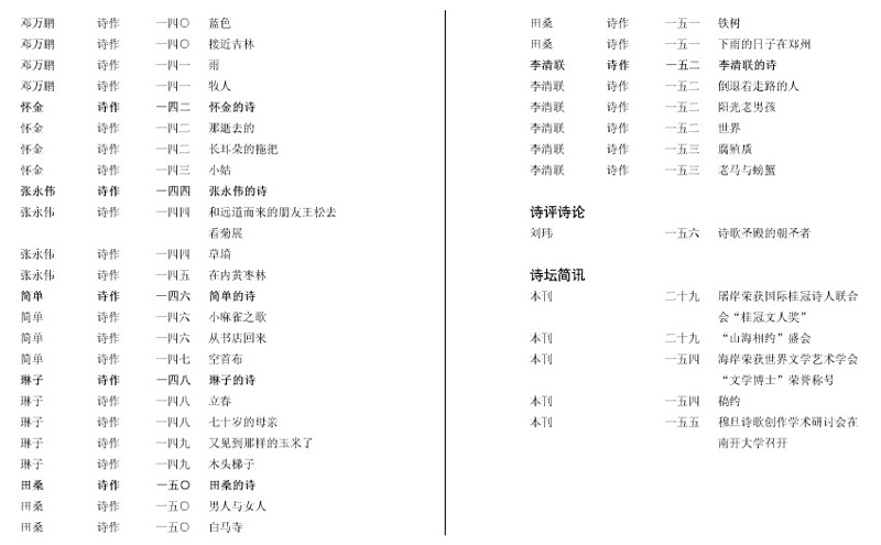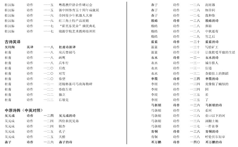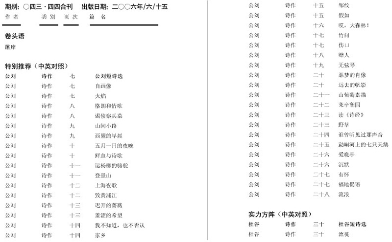 第43·44期卷头语 中国新诗—或者叫现代汉语诗,包括海外华人的汉语新诗的历史,如果以《新青年》杂志发表白话诗作为开端的话,那么始於1917年;如果以第一本白话诗集的出版作为开端的话,那么始於1920年。明年,2007年,可以说是中国现代汉语诗诞生九十周年。我们将以对诗的虔诚、对诗的尊崇、对诗的感恩、对诗的奉献之情,来纪念这个伟大的九十华诞! 历史是人民创造的,诗史是民间歌手、诗人和读者创造的。现代汉语诗史是现代汉语诗人、歌手的作品和他们的读者创造的。一部史书,如果仅仅是史实的堆砌,那只能是资料库。一部史书,如果缺乏足够的史料,那将受制于视野的偏狭。为史家写好现代汉语诗史,史料的完备十分重要。本刊上期(第42期)《卷头语》中为自己提出的三项任务中有一项是“抢救”或者叫“保存”。这就是要抢救或保存现代汉语诗大量作品(包括经典作品和优秀作品)的文本。 唐代殷潘选编的唐代开元、天宝年间诗歌作品选集《河狱英灵集》,是一个有审美原则的、优秀的选本,但恰恰缺失了大诗人杜甫。如果据这个选本来写这一段诗史,那将成为“遗憾的艺术”。 本刊与“中外现代诗名家集萃”的各个系列有著兄弟般的血缘关系。本刊发表的作品,有的已收入其中一个系列《夕照诗丛》。从2004年起,《夕照诗丛》已出版十几位诗人的汉英双语《短诗选》,他们是:灰娃、蔡其娇、晏明、艾青、严阵、莫洛、冰心、卞之琳、冯至、杨山、胡风、郑敏、胡昭、杜谷、莫文征、公刘、覃子豪、吴钧陶等。这套诗丛的编辑出版工作将继续努力进行,“夕照”是“集萃”多个系列中的一个。从其名称可以看出,它收集的目标是老诗人,包括健在者和已故者。 历史和现时是两个概念,二者的界线是清楚的。但今天的现在到了明天就成为过去。此刻的现时看到了下刻就成为历史。不断成长的青年诗人正一代又一代地涌现。他们也写出了优秀的、以至杰出的作品!本刊和“集萃”为保存历史的记录,对青年诗人作品的文本十分重视,为他们提供了、还将提供充分的园地。因为他们代表著现代汉语诗的未来。本期就郑重推出了“中原诗阵”专辑和粤、湘、赣边区24位青年诗人作品组成的“红三角”诗丛专辑。 让我们以勤奋的工作和满怀的信心,来迎接2007年这个庄严的时刻!