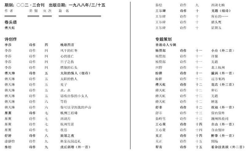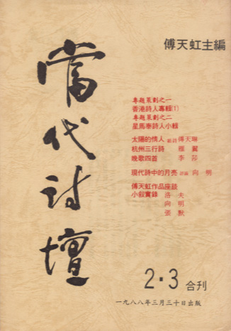 第2·3期卷头语 值出刊之际,愿重申:本刊“促进诗艺交流,促进中国诗的现代化”为已任,这个宗圣是坚定不移的。本刊不提倡“一言谈”。故只要不是伪诗,无论何种形式,何种内容的好作品,本刊均愿广为接纳,藉此推动诗坛的万紫千红。 欢迎诗人、诗评家踊跃来稿。 在香港编诗刊,委实吃力、纸张印刷和邮费贵得惊人,但我们对这份诗刊仍然充满信心。尤其是创刊号后,海内外数百封热情洋溢的来信以及许多电话,给了我们极大的鼓励。现在,张诗剑等一群颇具实力的的香港诗人,从下期起,加入我们的编辑队伍,这势必带来更加蓬勃的朝气。 为适应新的形式,本刊下期起改版并增加篇幅。 傅天虹