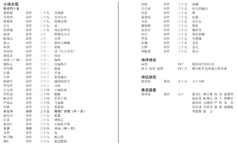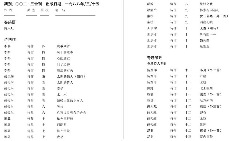 第4期卷头语 这一期“当代诗坛”,以全新的面目和读者见面了,相信爱诗的朋友们,现在一定会有和我们一样激动的心情。 虽然辛苦,写诗是一件快乐的事,办诗刊也是一件快乐的事。我们这群诗傻子,省吃俭用办起这份诗刊,目的只有一个,那就是以诗会友。有一份诗刊就多一份园地,我们希望通过诗艺交流,能为促进中国诗的现代化作些努力。 近年来,随着内地的改革开放,新诗实际上已有了一个完整的中国背景,只要勤奋笔耕,相信一定会有更多的好作品问世。 本刊是一份独力自主的诗学杂志,我们反对“一言谈”,园地绝对公开,欢迎诗友们踊跃来稿给予支持。 最后,还要提一下的是,本刊的改版和印行,得到了香港银河出版社的大力协助和支持。谨表感谢。 傅天虹 一九八八年七月
