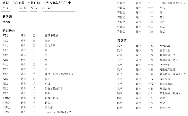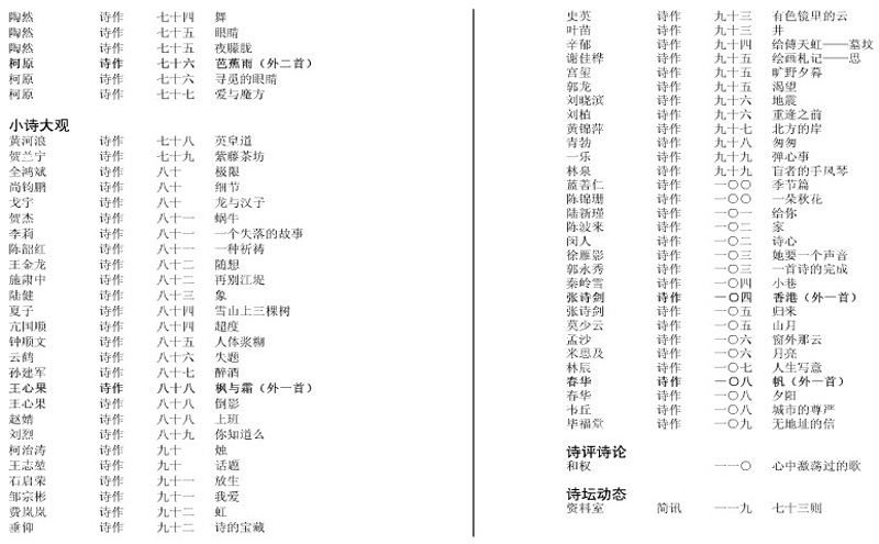 第5期卷头语 虽然财力和人力上均有困难,这也是早在预料中的事,“当代诗坛”仍是顽强地和诗友们见面了。这段时间,许多热心的读者寄来信件,问寒问暖,表现出极大的关切和爱护,我们深为感动,并愿以此鞭策,更用心地去编好这份诗刊。 新的一年里,我刊打算策划几个专题,包括“两岸青年诗人专辑”、“两岸女诗人专辑”、“短诗百家”、“散文诗集萃”等,每一期还将特别推荐几位优秀诗人的优秀作品。 诗,可以偏爱,但绝不偏废。我们提供这块小小的园地,希望能为促进大中华诗艺交流尽一点心力。 傅天虹 一九八九年春