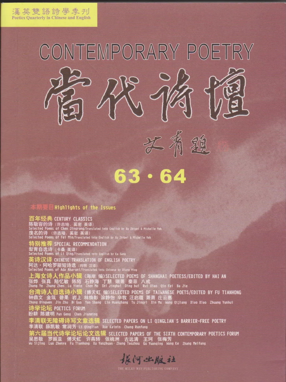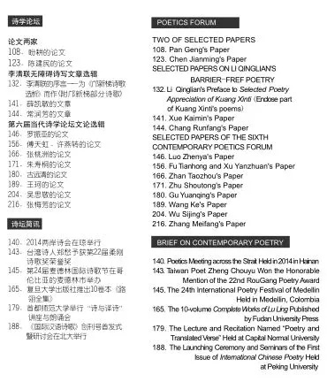 第63·64期卷头语 2014年4月10日,应本刊主办单位北师大珠海分校文学院及华文所的邀请,著名诗人余光中先生在阔别七年后,再次来到珠海,并于10日晚在分校的国际交流中心三楼报告厅以“诗美学漫谈”为题向该校师生传授其创作经验及心路历程。大批师生及媒体记者慕名前来,报告厅座无虚席,许多同学更是席地而坐,可谓盛况空前。 6月21日至24日,和本刊颇具渊源的“当代诗学论坛”,在香港岭南大学举办了第六届研讨会。这届论坛由中国当代文学研究会与香港岭南大学人文学科研究中心联合举办,来自两岸四地各大高校和科研院所的吴思敬、傅天虹、罗振亚、古远清、章亚昕、王珂、张梅芳、龙扬志等多位学者齐聚岭南大学,深入探讨了从抗战到冷战及其后的汉语新诗创作与研究,也探讨了两岸四地中生代诗歌在中国当代诗坛的地位,总结了汉语新诗的发展规律和内在经验,进一步加强了两岸四地诗歌研究的交流和学术合作。本期选载了部分会议论文,以饕读者。 10月18日,由洛夫、张默和痖弦共同创办的蜚声海峡两岸的台湾《创世纪》诗刊,于台湾中山南路的张荣发基金会大楼举办了“创世纪六十年庆典”,宾朋满座。该庆典由元老张默主持,首先由元老洛夫、痖弦致辞,接着文化部长龙应台等一行贵宾相继上台表示祝贺之意。本刊主编傅天虹也应邀出席庆典,并于会前与台湾白灵教授共同主编、完成了庆典纪念文本《台湾中生代诗人两岸论》。本刊副主编盼耕也应邀为会议撰写了长篇论文《<创世纪>诗社诗刊与香港诗社诗刊比较》,现全文刊出,同时,也发表台湾亚州大学陈建民的一篇有关论文。 在本期“百年经典”栏目中,有陈敬容、废名二位诗坛名家中英对照的短诗选辑,十分精彩。犁青是香港老诗人,本期特别推荐他自选的一辑短诗。犁青的诗有其特色,雁翼曾赞赏他是“为美而生的诗人”。 更令人感佩的是犁青不顾年迈多病,近年组织学者专家,策划完成了近百万字的《香港新诗发展史》,该书现在已由人民文学出版社郑重出版,本刊仅表祝贺。“英诗汉译”“上海女诗人作品小辑”“台湾诗人作品小辑”等栏目里也不乏佳作。此外,我们还发表了有关“无障碍诗写”的三篇文章,“无障碍诗写” 是李清联老诗人针对时弊而提出的诗歌创作准则。 本刊园地公开,请继续支持我们。