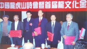 由中华诗词学会、国际炎黄文化研究会、鹰潭市风景旅游区管委会、鹰潭市文联、鹰潭诗社共同举办的中国龙虎山诗会暨首届龙文化金奖颁奖典礼于11月7日——9日在道教圣地江西龙虎山举行。来自印度尼西亚、马来西亚和祖国台湾、香港、澳门等全国各地的中华诗词名家、炎黄文化研究学者、社会名流共150余人,欢聚一堂,共同探讨二十一世纪中华诗词、炎黄文化的研究发展方向。 大会由国际炎黄文化研究副会长、鹰潭市作家协会主席张炜先生主持。中共鹰潭市委书记萧茂普致开幕词,中共鹰潭市委副书记、市长缪兵致闭幕词,鹰潭市风景旅游区管委会党委书记李志坚致欢迎词。鹰潭市文联主席何长生在会议结束时讲了话。中共鹰潭市委、市人民政府领导施国强、杜德春、李萍文等分别出席了开幕式。 中华诗词学会副会长周笃文、国际炎黄文化研究会常务副会长傅天虹、向明、张作斌、中华诗词学会顾问蔡厚示、林从龙等自始至终参加这次盛典。 中华诗词学会会长孙轶青,国际炎黄文化研究会会长梁披云,国际炎黄文化研究会名誉会长任仲夷,诺贝尔奖得主、著名科学家杨振宇,诗坛泰斗臧克家等分别向大会发来贺信并派代表出席了盛典。台湾国画大师欧豪年、广东雕塑大师曹崇恩向大会赠送了绘画和雕塑作品作为纪念。 大会颁予华裔物理学家杨振宇、著名诗人藏克家“终身成就奖”;颁予台湾国画大师欧豪年、著名雕塑大师曹崇恩、香港中旅协会名誉会长马志民、中华诗词学会会长孙轶青、中国道教协会副会长张继禹以及鹰潭市委书记萧茂普、市长缪兵等对弘扬炎黄文化有突出贡献的社会名流“特别荣誉奖”。在参赛的六百多件作品中评出了一、二、三等奖100名。 大会在海内外引起强烈反响。香港文汇报、大公报、澳门日报、中国艺术报、解放军报、广州日报、广州《电视周刊》等均发布了消息报导。