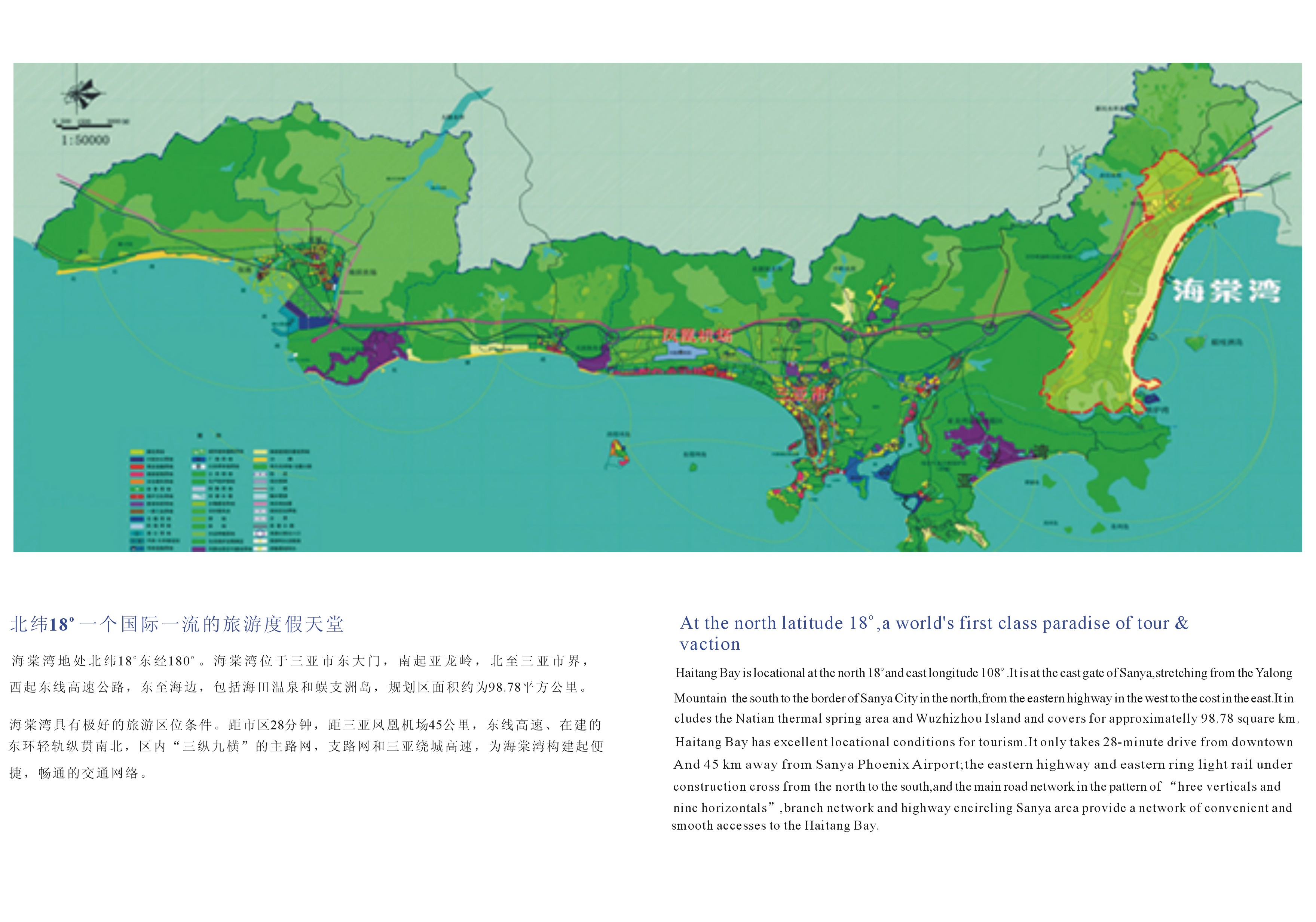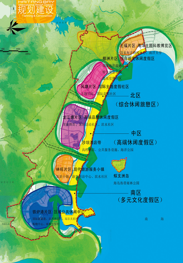 为高品质地开发海棠湾,2005年三亚市组织了海棠湾规划方案的国际竞赛,省政府于2007年5月批准了海棠湾的分区规划。省委、省政府高度重视海棠湾开发建设,将其列为海南“十一五”重点建设项目。海棠湾规划区域总面积98.78平方公里,现有人口约3.52万人,海岸线长21.8公里,规划期2020年末人口总规模25万人。近期,中国城市规划设计院正对海棠湾规划进行整合和提升,赋予其更加丰富的文化内涵,使海棠湾由平面规划上升到立体空间规划,使其更具前瞻性和可操作性。