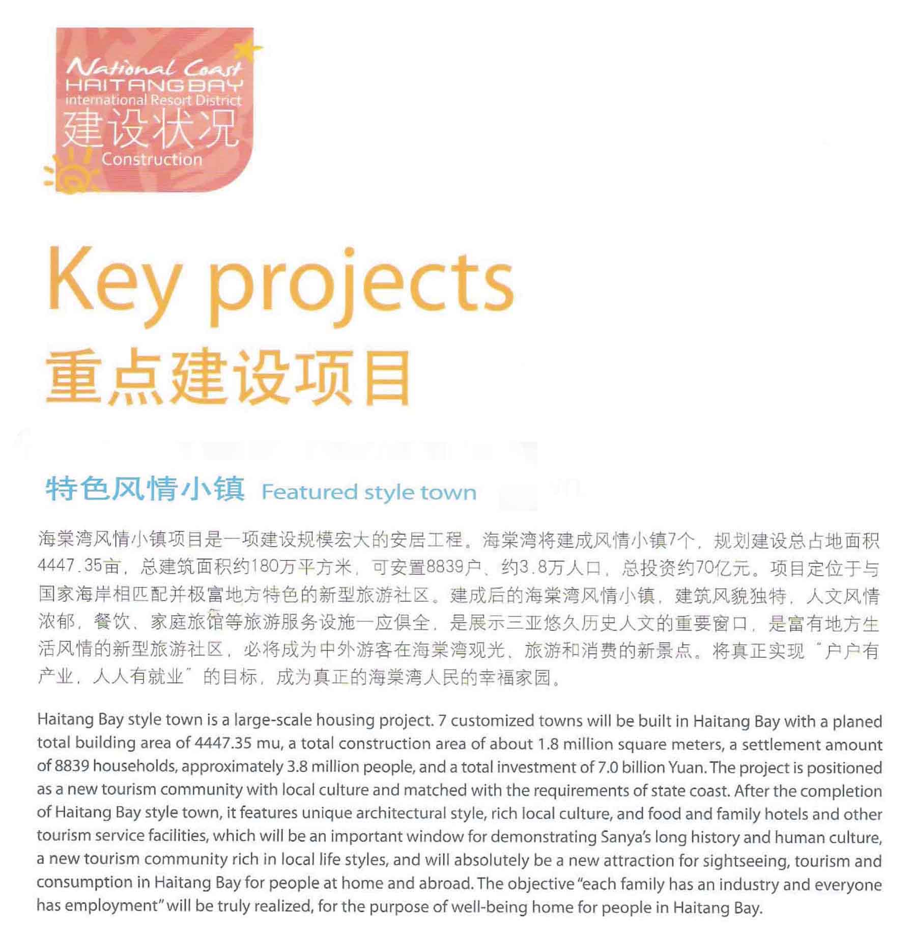 海棠湾特色风情小镇项目是一项建设规模宏大的安居工程。海棠湾将建成风情小镇七个,规划建设总占地面积4447.35亩,总建筑面积约180万平方米,可安置8839户,约3.8万人口,总投资约70亿元。项目定位于与国家海岸相匹配并极富地方特色的新型旅游社区。建成后的海棠湾风情小镇,建筑风貌独特,人文风情浓郁、餐饮、家庭旅馆等旅游服务设施一应俱全,是展示三亚悠久历史人文的重要窗口,是富有地方生活风情的新型旅游社区,必将成为中外游客在海棠湾风光、旅游和消费的新景点。将真正实现“户户有产业,人人有就业”的目标,成为真正的海棠玩人民的幸福家园。