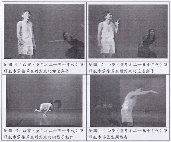 因赵天福的夸张演出而起的笑声,让我们发现全剧以赵天福为表演中心主体的事实。舞台各种元素都只是一种“路径”,盲乐师的音乐、背景的现代舞蹈、投射的灯光,都只是在聚拢、抵达、强化作为终点的中心,将赵天福成为舞台中心焦点。甚且,它们还放大了表演者带给观众的情绪渲染力。而这些舞台效果在此都类似于前述对各演绎作品分析时,所提及的补注话语。