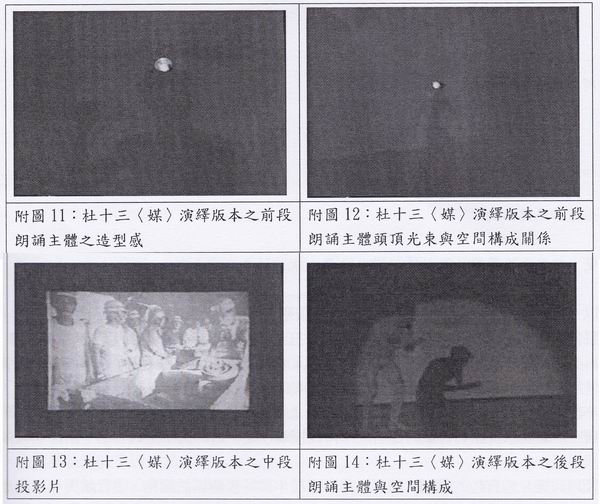 展演的界面——“剧场舞台”使得“诗的声光”的立体化文本比一般平面化诗作介入更多必须衡量的课题。由于现实中的表演舞台,其场地存在着时空限制。就时间限制来说,表演时间过长一来观众无法负荷,而租借场地也往往有一定的时间配额。就空间限制上,舞台的空间有限,如何进行有效区隔、道具搬动、灯光摆置都是大问题。