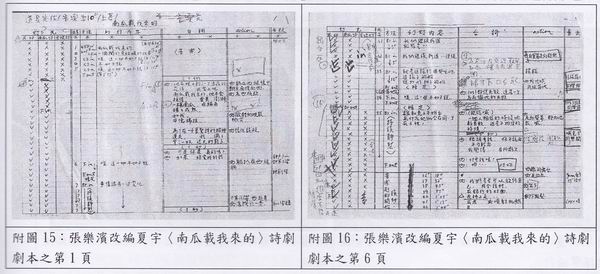 “诗的声光”中夏宇<南瓜载我来的>演绎版本,乃是由张乐滨进行改编的诗剧。就笔者田调所获得宝贵张乐滨<南瓜载我来的>手稿剧本可以发现,因为夏宇<南瓜载我来的>原本的诗作行数极长,比起其他诗人的中短型诗作有更多视觉、听觉细节可以经营,因此从附图15、16之“张乐滨改编夏宇<南瓜载我来的>诗剧剧本”可以发现手稿剧本中,有着许多细微(腻)的改编动作,其改编的操作项目包括:幻灯片内容、台词、动作、音效以及统摄整体的步骤方法。