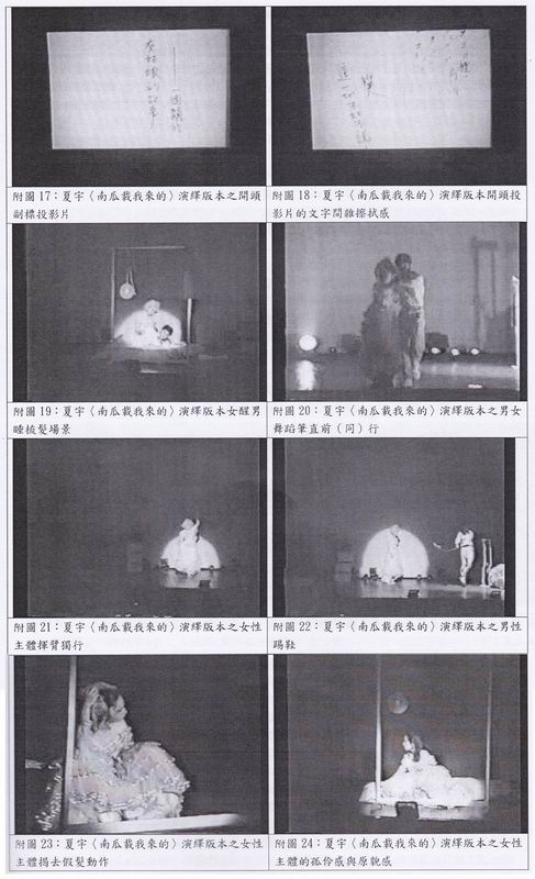 (一)相较於夏宇<南瓜载我来的>原诗与演绎版本中,女性对灰姑娘童话规之徇之,甚至刻意掉鞋。男性在最後刻中止童话的叙事铺展,他下捡鞋,反而催促女主角离去,吊诡地应合著夏宇<Salsa>所言:“我跟你一起去革命/但是允许我随时可以逃走”的字句。