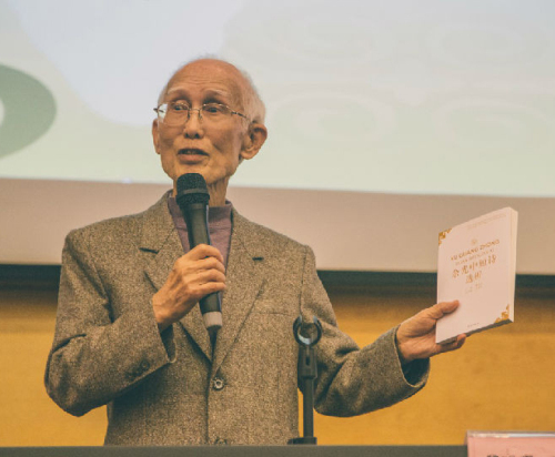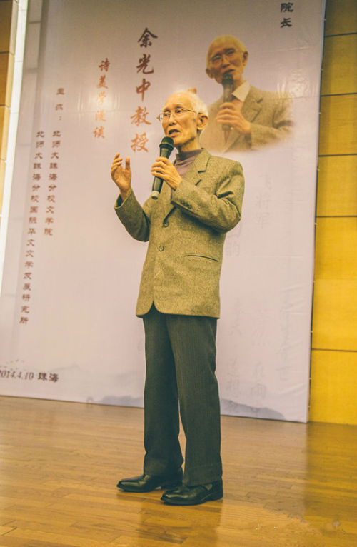 余光中先生受大家的热情感染,“漫谈”一开始便激动得于《余光中短诗选析》出版的用心,并幽默谈笑,与大家简略分享其右手写诗,左手成文,兼擅翻译和评论的创作历程,坦言心声:“我一生的写作,缘于对母语的爱好。”并慨叹“少小离家老大回,乡音无改鬓毛衰”。在与学生的互动交流中,余光中先生还深入浅出地向在座师生讲述边缘化的现代诗人与诗歌的情况,从八十年代现代诗盛行一时讲到诗人结社互不佩服比赛写诗,最后语重心长叮嘱同学们“多读文学史,就会知道兴衰是常理。”而谈及他的文学创作时他说:“诗歌和散文是我的两只眼睛,必须并用才能看清这个立体的世界,所以两只眼睛要合到一起看”。最后余先生又和大家从文学史的角度比较中西方文学创作的差异,让在场的同学受益匪浅。