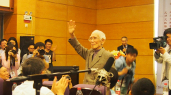 与师生互动结束后,文学院院长张明远发表漫谈会总结讲话,谈到余光中先生七年前即兴在珠海分校创作了 《乡愁》第五韵并向大家展示原件,称赞余先生是一座桥,连接了古代和现代,中方和西方。号召同学们认真听余先生教导“大家不要做粉丝,争取做知音。”并嘱咐听完余先生字字珠玑的漫谈,一定要慢慢消化余先生的智慧,要讨论、要反思,强调诗歌不仅仅是有感而发,还要有思而发。而该场漫谈会在文学院诗社的诗歌朗诵中结束,主办方特意安排将《乡愁》第五韵附上并以此为尾,致敬余光中先生——“而未来/乡愁是一条长长的桥/我去那头/你来这头”, 余光中在经久不息的掌声中离开报告厅。