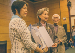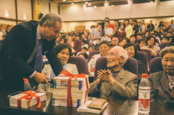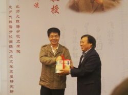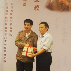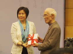 为欢迎先生并向先生求教,文学院教授、国际华文文学发展研究所常务副所长傅天虹教授指导“汉语新诗欣赏与创作教授工作坊”的学生,在银河出版社社长路羽(傅小华)女士的帮助下,出版了《余光中短诗选析》一书,该书精选了余光中先生1949-2012年的短诗,全部由该文学院学生品赏写析文。会上,北师大珠海分校的常务副校长傅爱兰女士代表该校将此书——《余光中短诗选析》及纪念品赠送给余光中夫妇;傅天虹教授亦代表文学院及国际华文文学发展研究所将此书和“汉语新诗库”系列丛书(该丛书由北师大珠海分校华文所和澳门大学中文系选题策划)赠送给澳门大学中文系主任朱寿桐教授、北师大珠海分校图书馆。