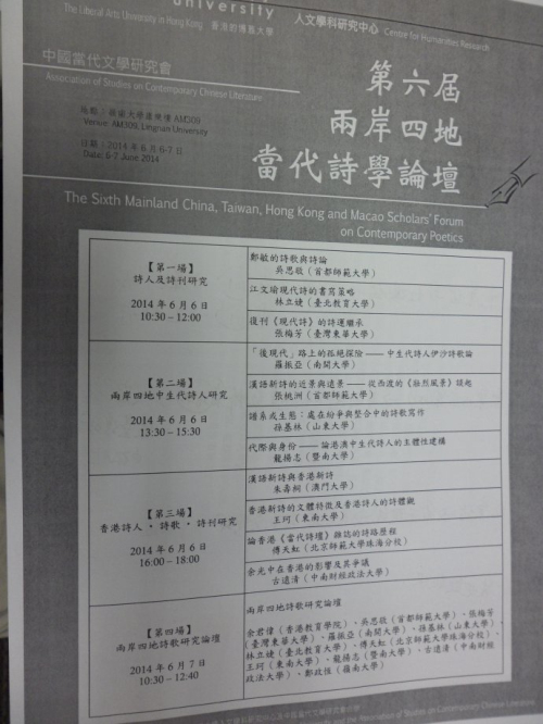 为进一步加强两岸四地诗歌研究的交流和学术合作,探讨从抗战到冷战及其后的汉语诗歌创作与研究,并继续探讨两岸四地中生代诗歌在中国当代诗坛的地位,总结汉语新诗的发展规律和内在经验,中国当代文学研究会与香港岭南大学人文学科研究中心拟定于2014年6月6-7日,在香港岭南大学校内联合举办“两岸四地第六届当代诗学论坛”。